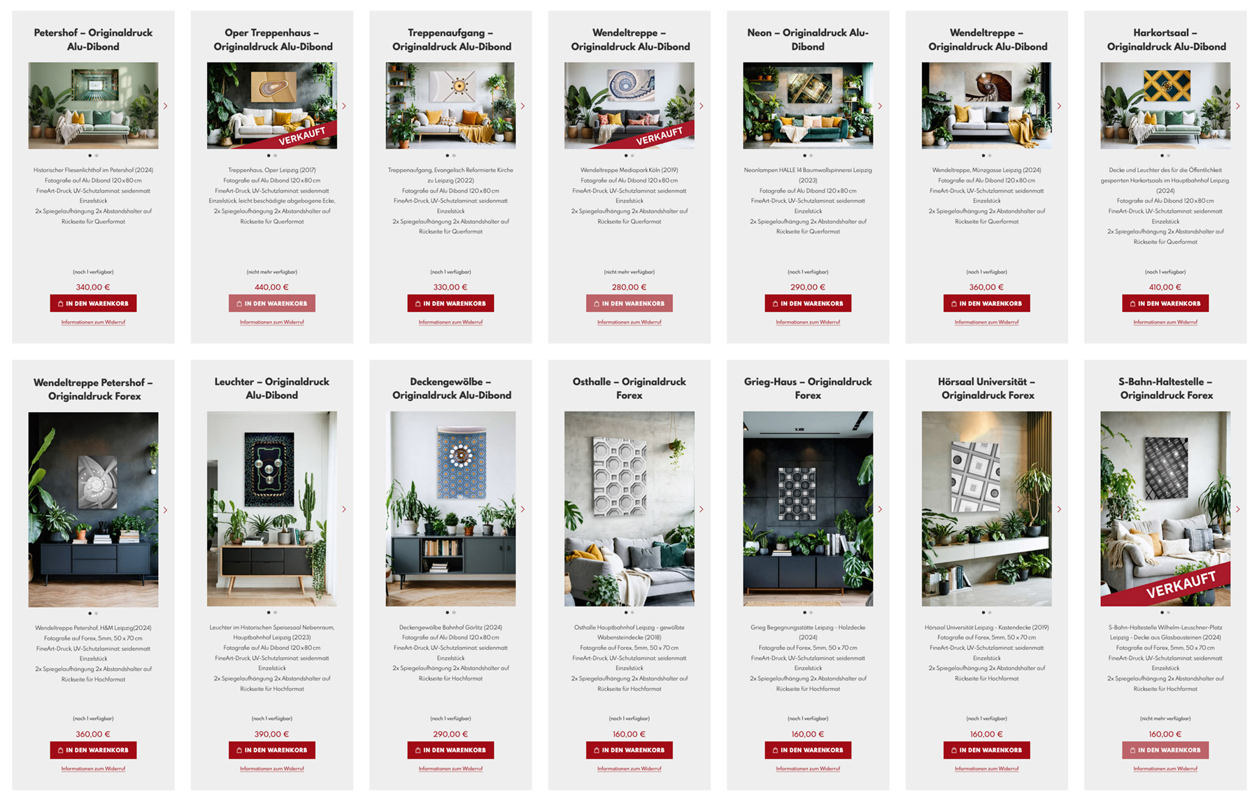 Originaldrucke und Einzelstücke meiner vergangenen und aktuellen Ausstellungen wie beispielweise »Triplum«, »Leipzig über Kopf«, »Flores Mensis« und »Station Looks« sind ab sofort in meinem Shop erhältlich. Die auf Alu Dibond oder Forex im FineArt-Druckverfahren produzierten Bildmotive haben eine Größe von 120x80cm bzw. 50x70cm und ein seidenmattes UV-Schutzlaminat. Auf den Rückseiten sind je zwei Spiegelaufhängungen und Abstandshalter angebracht.