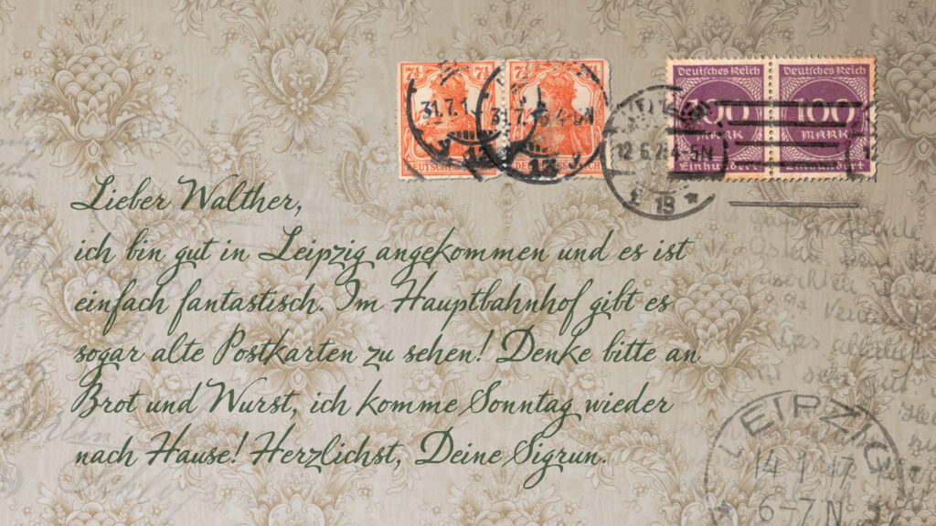 Die einzelnen Karten sind in unterschiedliche Holzbilderrahmen eingefügt, die ich auf einen Tapetenhintergrund schraubte. Jahresangaben und Bildbeschriftungen ergänzen jede Leipziger Ansichtskarte. Und zwischendrin finden sich immer wieder einige FunFacts um den Hauptbahnhof und dessen Bau. Auch einige Rückseiten schafften es auf die Ausstellungstafeln. Allein die Werte der Briefmarken sind erstaunlich: sie reichen von 2 1/2 Pfennig bis hin zu inflationsbedingt 200 Reichsmark. Die im Laufe der Zeit wechselnden Schriftarten von Kurrentschrift zu Sütterlin und gebräuchlichen Schreibschriften sind ach inhaltlich spannende Zeitdokumente.