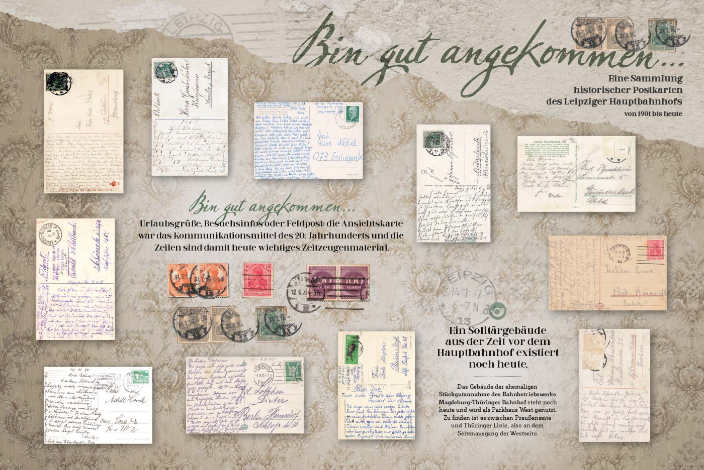»Bin gut angekommen…« zeigt auf einem halben Dutzend Tafeln rund 40 historische und originale Postkarten des Leipziger Hauptbahnhofs von 1901 bis heute. Dazu sind Bildbeschreibungen und ergänzende Infos zur Geschichte des denkmalgeschütztem Gebäudes ergänzt.