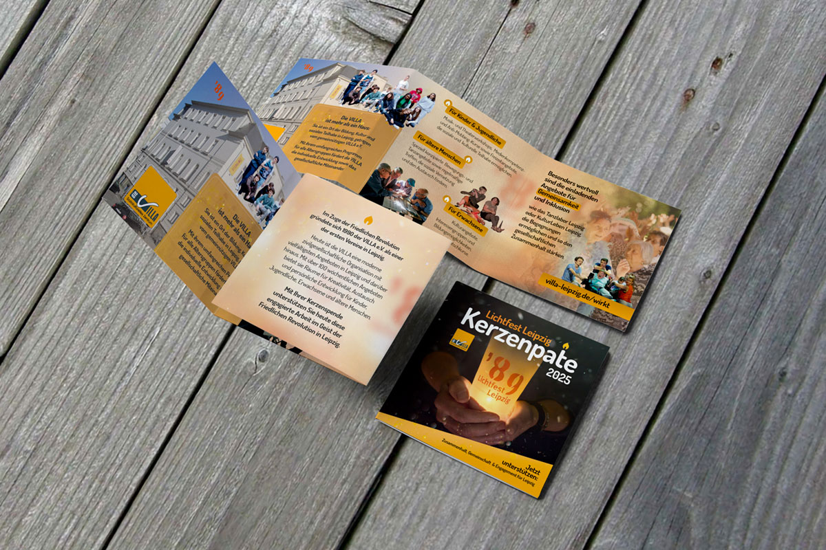 Mensch, wie dir Zeit vergeht… Seit fast zehn Jahren unterstütze ich das soziokulturelle Zentrum VILLA e.V. in dessen Arbeit. So war es natürlich klar, dass ich sofort die (foto)grafische Umsetzung übernahm, mit einem zur Kerzenpatenschaft 2025 im Villakeller entstandenen Titelmotiv und einem kleinen kompakten Flyer.
